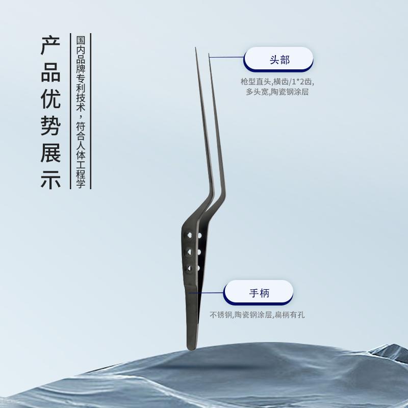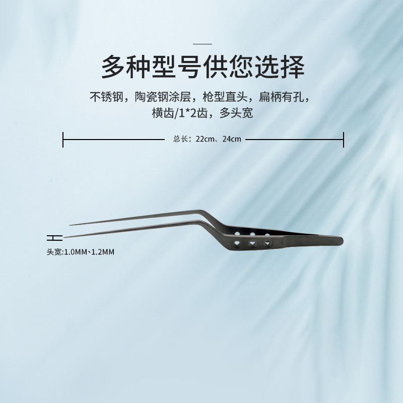 50.0322.22显微镊枪型直头,22cm扁柄有孔,头宽1.2mm,1*2齿 陶瓷钢涂层